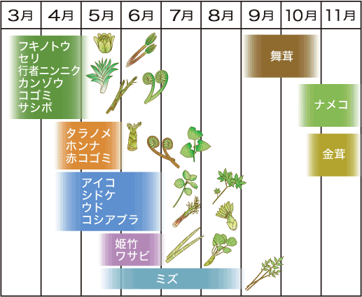 どの時期にどんな山菜が採れるかについては、下のカレンダーを参考にしてください。ただし、山の幸が採れるタイミングは場所によっても違いますし、天候に大きく左右されるので、飽くまでも目安とお考えください。